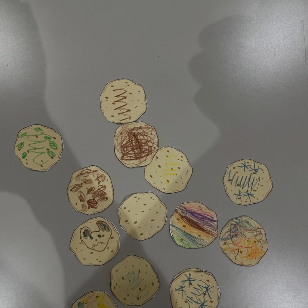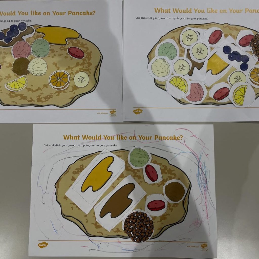 早くできた子は、2番目のパンケーキ工作に進みました。小さいパンケーキの上に、色鉛筆で自由にトッピングを描くものです。