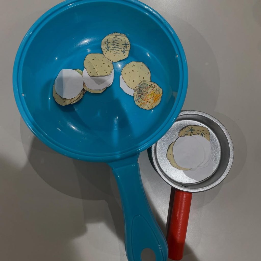 自宅にあったフライパンのおもちゃを持参し、パンケーキレースに使いました。先ほどパンケーキ工作2で作ったミニパンケーキを乗せて、リレー形式で競争しました。