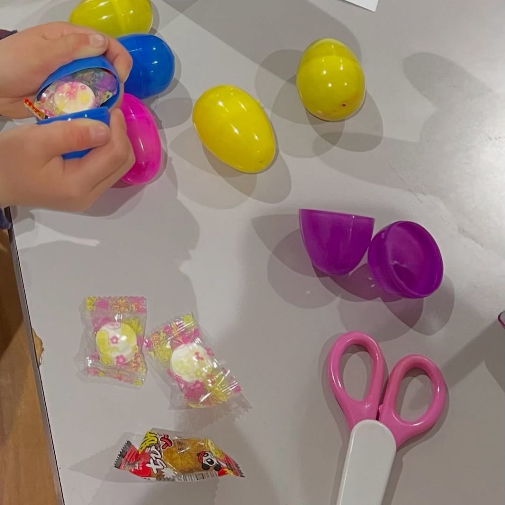 2回目は、卵の中にラムネなどの小さなお菓子を隠しました。みんな興奮気味に中身を取り出していました。