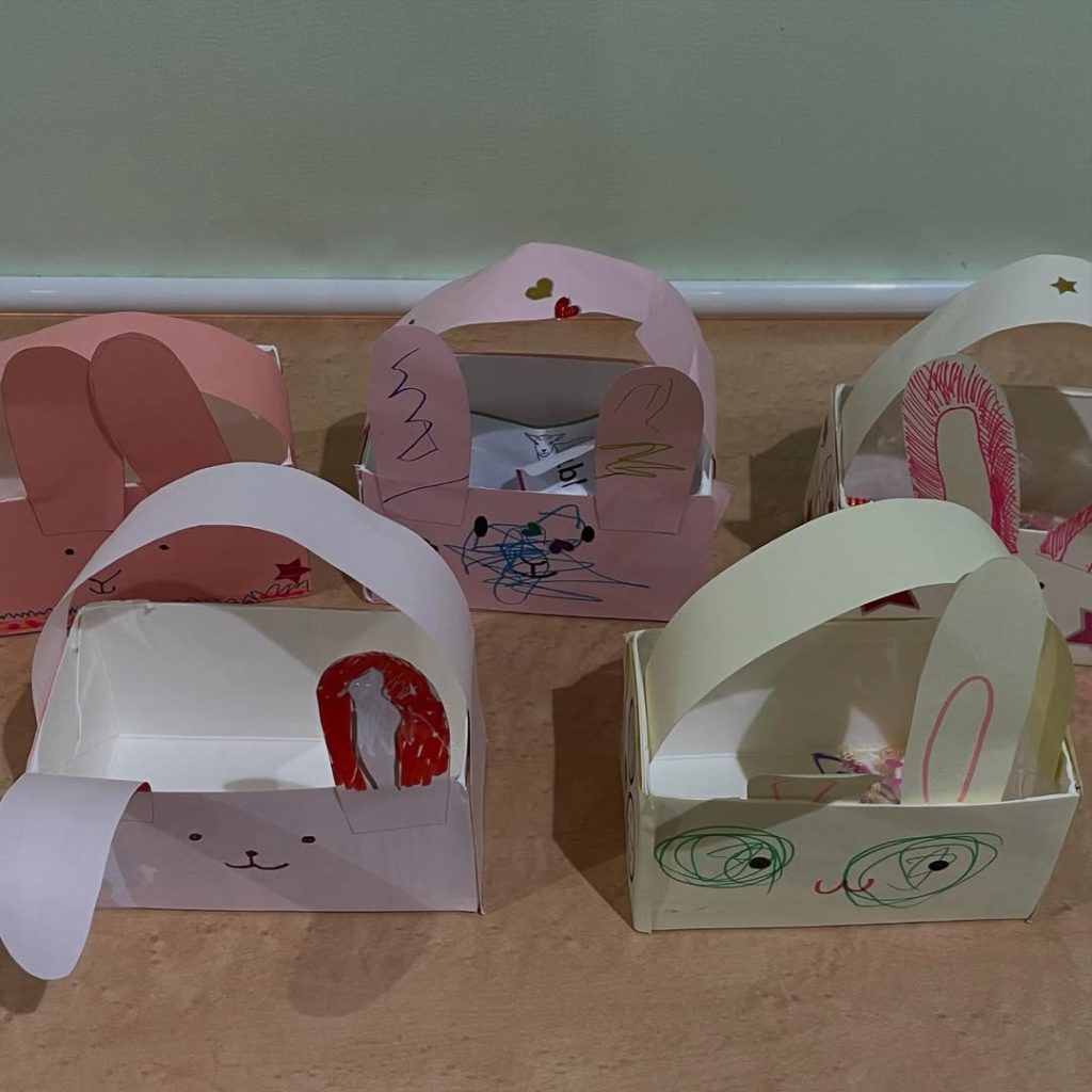 牛乳パックの箱で、イースターバッグを作りました。うさぎの耳をつけて、箱にデコレーションするやり方です。シールも貼って、個性的なバッグをそれぞれ作ることに成功しました。